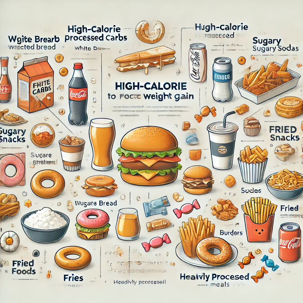 반면, 아래 음식들은 **고칼로리 & 혈당을 급격히 올려** 체지방을 쉽게 쌓이게 합니다. 특히 **가공된 탄수화물 & 설탕이 많이 포함된 음식**은 다이어트의 적입니다.